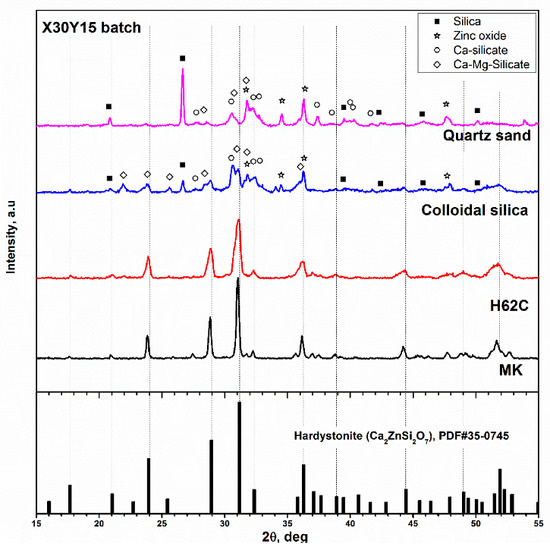 Considering the Sr and Mg amounts in the already recognised hardystonite-based biomaterials [26,27], we selected the X30Y15 formulation for additional experiments, aimed at evidencing (for the first time) the specific role of preceramic polymers. In fact, silicones, as a silica source, had a synergistic effect with oxide fillers on phase evolution. Figure 2 shows the diffraction patterns of ceramics corresponding to the X30Y15 formulation obtained (according to the same firing schedule) from two different silicones and two different forms of silica. One could suppose that using calcium borate which leads to a liquid phase, could provide a strong ‘fluxing’ action and dissolve most parts of the other components at the early stages of firing, forming a viscous mass and later crystallising into a hardystonite solid solution. It was evident that neither quartz sand nor the more reactive colloidal silica led to the expected phase. Calcium and calcium-magnesium silicates (Ca2SiO4, PDF#31-0298, and CaMgSi2O6, PDF#89-1484) could be found along with quartz (PDF#86-1560) and ZnO (PDF#89-0511).