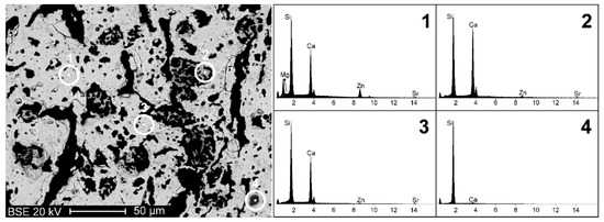 The pellets from MK were subjected to a refined microstructural and mineralogical analysis. SEM-EDS analyses (Figure 3) showed that the X30Y15 sample constituted a fairly homogeneous porous matrix with a dominating content of Ca and Si, but also included Zn, Sr, and Mg (spectrum 1 in Figure 3). Such experimental evidence indicates a successful incorporation of the elements in the solid solution (B was not detectable by EDS analysis). However, some portions with different chemical composition, i.e., with a darker colour in the backscattered electron image, were detected. The Ca/Si ratio in these portions presented significant variations, passing from high levels (spectra 2–3), typically presented by wollastonite (CaSiO3, i.e., Ca/Si = 1), to particularly low levels, corresponding to almost pure silica (spectrum 4). Such experimental data indicate that the reaction process still did not lead to a full incorporation of all the chemical constituents into a single crystalline phase; however, hardystonite solid solution was largely dominant.