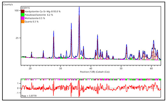 Furthermore, a detailed, multi-analytical approach, comprising microstructural, microchemical, and mineralogical investigations, was applied on pellets the X30Y15 formulation (derived from MK) to quantitatively verify the formation of a stable solid solution phase, including Sr2+, Mg2+, and B3+ ions, in the hardystonite structure. The cross-section of a fired pellet was firstly characterised by SEM-EDS (CamScan MX2500 SEM, Waterbeach, United Kingdom; EDAX, Mahwah, NJ, USA). Subsequently, the same pellet was subjected to a quantitative micro-chemical characterisation by wavelength-dispersive electron microprobe (WDS-EMP; Cameca SX50, CAMECA, Gennevilliers, France). Forty point analyses were acquired from homogeneous areas of the samples, calculating the weight percentages of boron oxide by subtraction from the overall sum of recalculated oxides due to the insensitivity of the instrument to light elements. Then, the mean composition of oxides in the solid solution was determined and used as the input for the calculation of the experimental crystal chemical formula. Finally, quantitative phase analysis (QPA) and structural refinement, based on the Rietveld method [32], were performed on a highly detailed diffraction pattern (14 h data collection with PANalytical X´Pert PRO, PANalytical, The Netherlands), using HighScore Plus 4.7 program package (PANalytical, Almelo, The Netherlands).