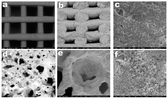 Microstructural details of highly porous ceramics based on hardystonite solid solution, after firing at 950 °C; (a–c) printed scaffolds; (d–f) Foams.