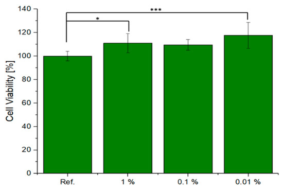 Preliminary cell tests were performed on X30Y15 scaffolds with the specific purpose of elucidating any cytotoxic effect. The cell viability of ST2 cells in the presence of the scaffold eluates is shown in Figure 6. The reference, which relates to cells cultured only with CCM, was normalised to 100%. Quantitative assessment after 48 h of culture shows that there was an increase in cell viability with a decrease in the concentration of the scaffold eluates in the cell culture medium. In the case of 0.01% dilution, the highest cell viability was achieved by the 0.1% concentration. The values are statistically relevant as the difference was greater than p = 0.001. The scaffold eluates were found to not be cytotoxic after 48 h of incubation in contact with bone marrow stromal cells.