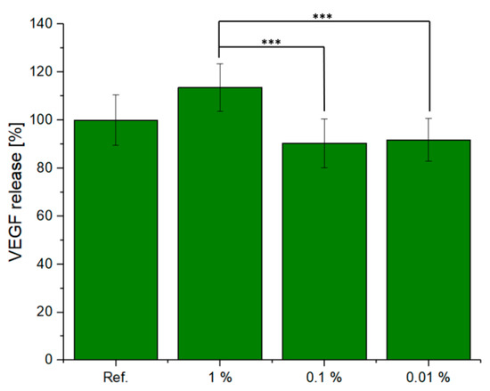 In Figure 7, the VEGF released from the ST2 cells cultured in CCM with different dilutions (1%, 0.1%, and 0.01%) of scaffold is shown. Measuring the increase in VEGF concentration when cells are exposed to dissolution products of biomaterials is a suitable in vitro methodology [42] to assess the potential angiogenic effect of the material being investigated, given that increased VEGF will attract endothelial cells, being thus a marker for the vascularisation potential of the biomaterial. The eluates of this scaffold increased VEGF secretion with increasing supernatant concentration. The 1% supernatant sample showed the highest release of VEGF for all three dilutions. These results were also in accordance with the data obtained from the cell viability study. However, the results also indicated no significant variation as a function of the reference sample.