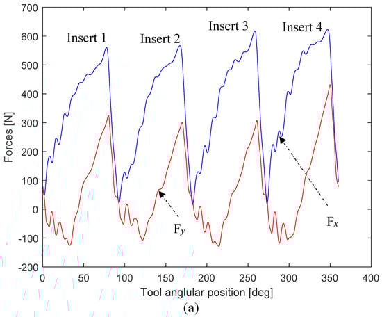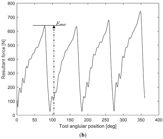 In the milling process, different cutting force components can be extracted from force signals. Ceramic inserts are significantly sensitive to vibration phenomenon, which in turn depends on the cutting forces in the x-direction () and y-direction (; Figure 1). Hence, the maximum resultant cutting force (Figure 2b) operating in the (x, y) plane was adopted in the present study. is given by the following formula: