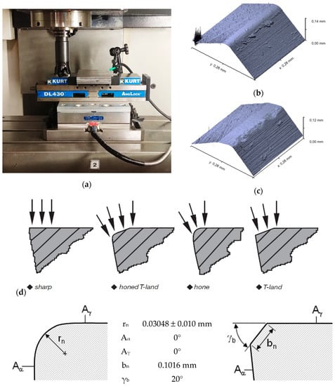 (a) Face milling setup with the cutting tool and force dynamometer, and micro-geometry of the (b) honed and (c) chamfered (T-land) cutting edge and (d) cutting edge forms with parametric edge dimensions (adapted from [36]).
