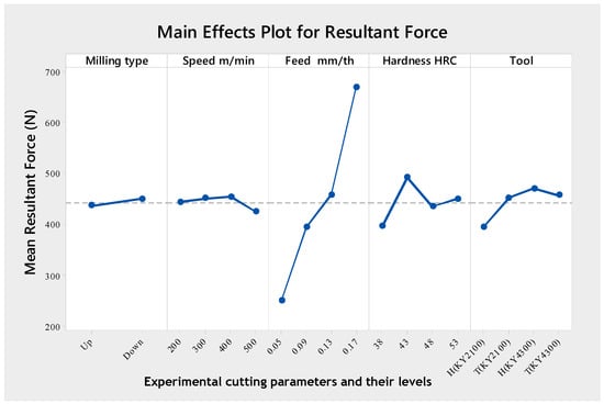 An analysis of the mean response of the resultant force is shown in Table 7. The table shows the optimal levels of the control factors for the resultant force values performed by the Taguchi method. These optimal values are also presented in Figure 4. The optimal cutting parameters for minimizing the resultant force could be clearly determined from this figure. The levels and mean ratios for the factors that give the best resultant force were MT (Level 1, mean = 435.7), vc (Level 4, mean = 423.7), fn (Level 1, mean = 249.4), H (Level 1, mean = 394.5) and CT (Level 1, mean = 393.1). In other words, an optimum resultant force value was obtained during up the milling type at 500 m/min cutting speed, 0.05 mm/tooth feed rate, 38 HRC material hardness and using a honed silicon nitride (SiAlON) base ceramic tool. From Figure 4, the use of high cutting speed and low feed rate generated lower cutting forces [42,43,44,45,46,47,48,49]. The decrease in cutting force from higher cutting speed was due to the rise in temperature in the shear plane area, which lowers the shear strength of the material [44]. In addition, the increase in the feed rate induced a larger volume of the cut material in the same unit of time, besides establishing a dynamic effect on the cutting forces. It also led to a corresponding increase in the normal contact stress at the tool chip interface and in the tool chip contact area [48,50,51]. From Figure 4, the tool grade material composition further compounded the influence of the honed edge preparation. Conversely, this property bears little or no effect on T-land edge preparation. The maximum resultant force was obtained at about 43 HRC. Further increase in material hardness (48–53 HRC) led to a decrease in the resultant force. This phenomenon has also been previously reported by Matsumoto et al. [52] and Chao and Trigger [53].