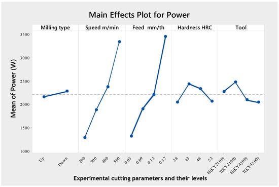 The analysis of variance (ANOVA) of the cutting power is shown in Table 8. From the table, it can be seen that the feed rate (F-value = 7.45) was the most significant terms related to the cutting power, followed by the cutting speed (F-value = 6.96). The table shows that the milling type, hardness and tool were not significant terms to the cutting power. The contributions of milling type, cutting speed, feed rate, hardness, tool, milling type × speed and milling type × tool on power were found to be 0.204%, 33.78%, 36.13%, 1.72%, 1.74%, 1.18% and 5.82%, respectively. Thus, an equivalent importance of the feed rate (36.13%) and cutting speed (33.78%) were observed to cutting power performance. Similar results were reported by Benlahmidi et al. [54] when turning hardened AISI H11 steel (50 HRC) with CBN7020 tools. They reported that the cutting speed, feed rate and depth of cut are the most significant terms on cutting power. This was also confirmed by Davim and Figueira [55] during the turning AISI D2 steel using traditional and wiper cutting tools. In milling processes, Fratila et al. [56] indicated that the increase in cutting power was associated with a corresponding increase of cutting speeds, feed rates and depth of cuts, when machining AlMg3 with HSS (high-speed steel) tools. This was also observed by Pa Nik et al. [46] who indicated an increase in cutting power with an increase in cutting conditions (feed rate and depth of cut) in both dry and wet machining conditions.