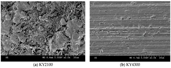 Tool wear investigations showed that flank wear and micro-chipping occurred due to abrasion of hard particles and the effect of recurring tool entry into the workpiece (Figure 6). No build-up edge (BUE) was observed during the experiments. This can be explained by the fact that the cutting speed used with ceramic is usually high. From the literature, the increase in alumina content improves the dissolution resistance of the material but this is prone to local plastic deformation at high temperatures [57,58]. Figure 7 shows a preview into the SEM microstructure of a worn part of the KY2100 grade insert with a composition of silicon nitride (SiAlON) and KY4300 with Al2O3 matrix reinforced with SiC whiskers. From the figure, the micro-shearing process and dissolution of the tool in KY2100 can be observed. Alternatively, the microstructural texture on a worn area of KY4300 tool grade shows a more compact topography, which is often more influenced by micro-scale abrasion. This is believed to be primarily as a result of the Al2O3 composition in the ceramic material, which improves its dissolution resistance during cutting.