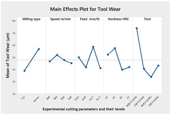 An analysis of the mean response for the tool wear, which is made by using the Taguchi method, is shown in Table 11 and Figure 8, which further highlights the significance of the cutting tool and milling type to wear. These results were in agreement with research carried out by Bouzakis et al. [59], which has shown that the kinematics of the milling process (up-milling or down-milling), considerably affects the achievable cutting performance. Hadi et al. [60] also demonstrated an increasing relationship between tool wear and up-milling kinematics. However, owing to the brittle nature of ceramics, there exists a combined effect of milling type and tool edge geometry for the wear generation in ceramics (Table 10). Severe chipping wear was often seen on honed tools with low hardness. This extreme wear is believed to be as a result of the sensitivity of the tool edge strength during impact with the workpiece, as a radial edge formation is more susceptible to impact fragmentation. This condition was reduced in tools with reinforced SiC whiskers. It is postulated that the high impact force on the lower end of the honed curve on the rake face is responsible for flacking. Optimal tool wear value was obtained with an up milling type at 500 m/min cutting speed, 0.17 mm/tooth feed rate, 48 HRC hardness and using a honed ceramic tool with reinforced SiC whisker.