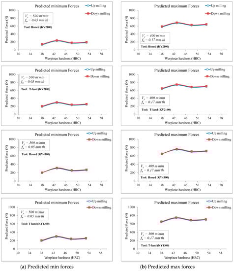 Comparison of the predicted cutting forces as a function of workpiece hardness and milling modes.