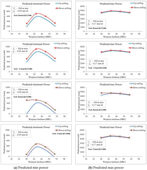 Comparison of the predicted power requirements as a function of workpiece hardness and milling modes.