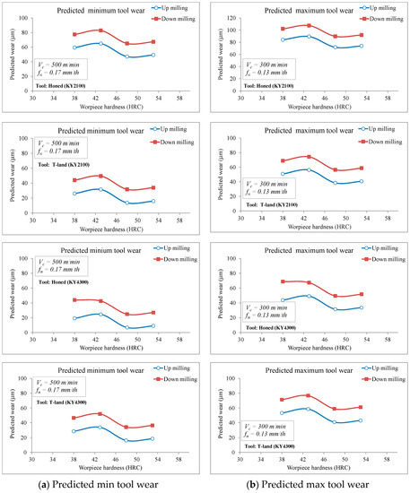 Comparison of the predicted tool wear as a function of workpiece hardness and milling modes.