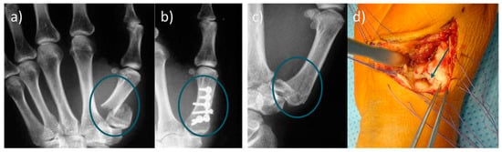 (a) Radiograph of a basal fracture of the thumb. (b) Conventional osteosynthesis of the basilar fracture; (c) radiological image of a Rolando fracture, and (d) representation of the small bone fragments in the joint area, which can only be fixed unsatisfactorily by classical osteosynthesis. Refixation of metacarpal fractures is usually complicated and time-consuming. Since limitations of conventional osteosynthesis exist, the use of bone adhesives would be particularly useful in the metacarpus area.