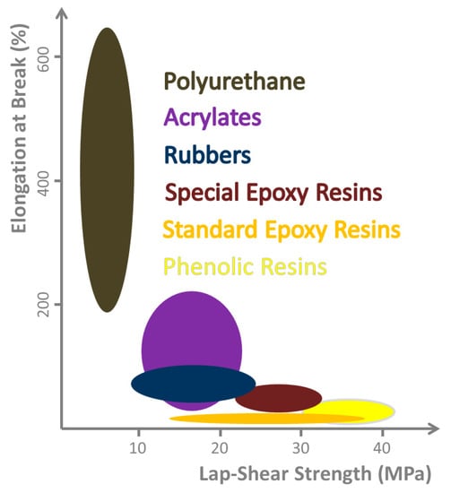 Range of mechanical properties obtainable with different chemical classes of adhesives. Relation between lap-shear strength and elongation at break, as they cannot be optimized independently. A case related compromise must be found, but in general, both properties should be as high as possible. (Illustration based on [30]).