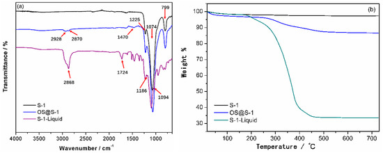 Figure 1. FT-IR spectra (a) and TGA trace (b) of S-1, OS@S-1 and S-1-Liquid.
