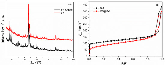 Figure 2. XRD patterns of S-1 and S-1-Liquid (a) and N2 adsorption/desorption isotherms of S-1 and OS@S-1 samples (b).