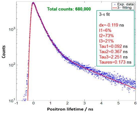 Figure 4 shows the recorded positron lifetime spectrum as well as the fitting curve by applying 3-component analysis. The first lifetime (τ1) indicates the positrons being annihilated in the bulk of the materials (<200 ps). The second lifetime, τ2, is attributed to the positrons being annihilated in defects (300–500 ps). The third lifetime, τ3, refers to ortho-positronium (o-Ps), a parallel spin complex of a positron and electron, which forms in low electron density regions, such as free volumes, holes, interfaces, and pores. The o-Ps lifetime and intensity are often associated with the size and concentration, respectively, of the open volume in materials. From the fitting procedure one obtains positron lifetimes and intensities. The o-Ps lifetime, τ3, is typically related to the average radius of a free volume element, r, which is assumed to be spherical, by Tao-Eldrup model,