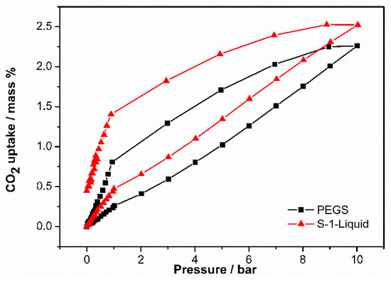 To further prove that the pores of S-1 are still empty in the S-1-Liquid, the CO2 capacities of it were determined by an Intelligent Gravimetric Analyzer. The CO2 uptake capacity of S-1-Liquid is enhanced compared to the PEGS, as shown in Figure 5. The CO2 uptake value of S-1-Liquid is 0.474 wt % at the pressure of 1 bar, while the uptake value of PEGS is 0.261 wt %. When the pressure increases to 10 bar, the CO2 uptake value of S-1-Liquid is 2.524 wt %, which remains higher than that of PEGS (2.261 wt %). Both the S-1-Liquid and PEGS have hysteresis loops. The S-1-Liquid remains more CO2 as the pressure decreases during the desorption process due to the permanent porosity. The CO2 uptake value of S-1-Liquid is 1.406 wt % at 1 bar, much higher than that of PEGS (0.809 wt %). There is 55.7% wt % of CO2 remains in the S-1-Liquid, demonstrating the potential application for CO2 storage.