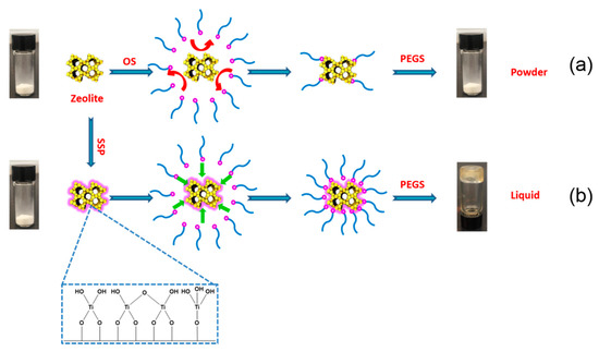 Scheme 1. Preparation of porous liquid with nanosized silicalite-1 zeolite. (a) Scheme without SSP; (b) Scheme with SSP. OS = organosilane; PEGS = poly(ethylene glycol) tailed sulfonate; SSP = surface sol-gel process.