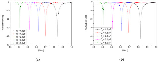 The AFSS absorber was numerically simulated by a high-frequency structure simulator (HFSS) in order to verify the equivalent circuit model. In Figure 2b, the minimum value of the reflectivity is modulated over a wide frequency band from 406 to 824 MHz when Cr varies from 1 to 5 pF. The numerical simulation suggests that the numerical solution approaches the theoretical solution very well.