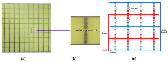 Photograph of the fabricated AFSS prototype: (a) the whole AFSS array, (b) the unit cell, and (c) a schematic diagram of the bias circuit.