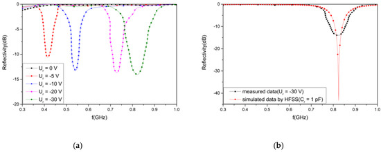 The reflectivity of the proposed absorber over the frequency range of 300–1000 MHz for various bias voltages was measured in the anechoic chamber of the Science and Technology on Electromagnetic Scattering Laboratory. The measurement setup for the compact range system is shown in Figure 4. Two identical horn antennas were utilized as transmitting and receiving devices, respectively. The spherical waves emitted by the horn antenna were reflected by a parabolic metal reflector before becoming a plane wave. A short test distance between the sample and reflector was easily realized to meet the far-field conditions. According to the datasheet of BB131, the junction capacitance Cr changed from 1 to 5 pF when the reverse bias voltage (Ur) varied from −5 to −30 V. The measured results are presented in Figure 5a. When the bias voltage was 0 V, the AFSS absorber had no absorption. When the inverse bias voltage varied from −5 to −30 V, the resonant frequency moved to a higher frequency and covered a frequency band ranging from 415 to 822 MHz below −10 dB. The total thickness was equivalent to only λ/72 of the lower limit frequency and λ/36 of the higher limit frequency. The measured results for various reverse voltages (Ur) ranging from −5 to −30 V agree roughly with the simulated results for a varying capacitance (Cr) from 1 to 5 pF. Both the measured and simulated results validate the tunability of the proposed absorber, providing a feasible method for absorption in UHF applications.