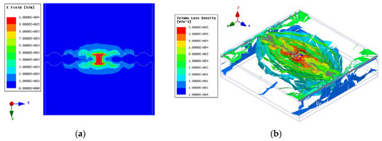 The simulated results obtained by the HFSS: (a) the electric field distribution and (b) the volume loss density distribution.
