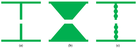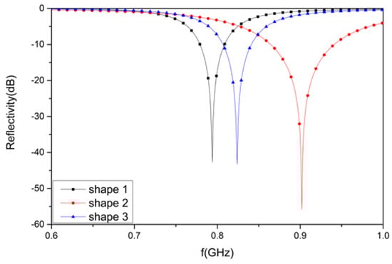 According to the waveguide handbook [35], L in Equation (2) is mainly determined by the shape of the AFSS element. This can be equivalent to the reactance component and eventually affects the resonance frequency of the designed structure. Figure 7 shows three AFSS cells with different shapes, whose parameters are consistent with Figure 1a. According to the equivalent circuit formula, the inductance L of shape 1 is largest, the L for shape 2 is smallest, and the L for shape 3 lies in the middle. Figure 8 shows the simulated reflectivity for these three AFSS absorbers with R = 2400 Ohms and Cr = 1 pF. The reflectivity nadir of the designed structure is −42.7 dB at 794 MHz for shape 1, −55.9 dB at 902 MHz for shape 2, and −43.2 dB at 824 MHz for shape 3. The relationship between the resonant frequencies for the three shapes is fr1 < fr3 < fr2.
