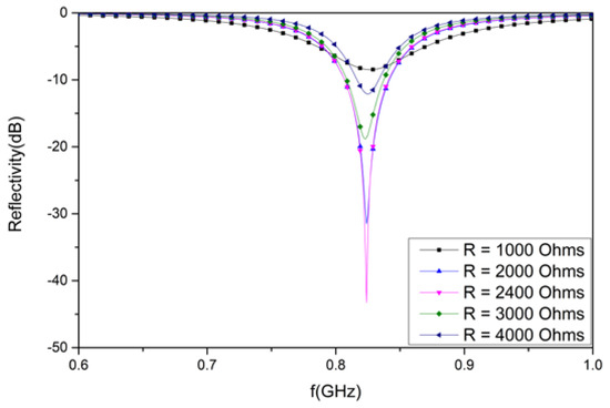 Figure 9 shows the simulated reflectivity of the proposed absorber with various R and fixed Cr = 1 pF. The reflectivity nadir of the designed structure is −8.5 dB at 827 MHz for R = 1000 Ohms, −31.5 dB at 824 MHz for R = 2000 Ohms, −43.2 dB at 824 MHz for R = 2400 Ohms, −18.8 dB at 823 MHz for R = 3000 Ohms, and −12.1 dB at 825 MHz for R = 4000 Ohms.