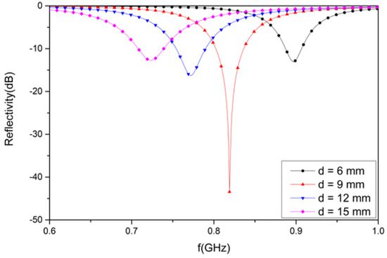 The higher the thickness of the substrate materials, the lower the resonant frequency. Further, when the thickness is 9 mm, the reflectivity of the proposed absorber is the lowest, achieving a perfect impedance matching effect.