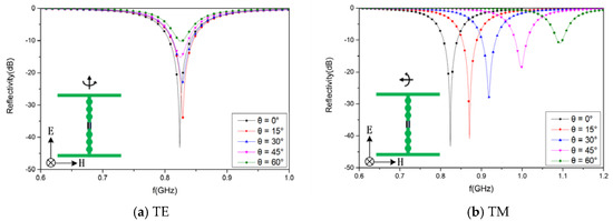 Under TM polarization, the reflectivity is lowest at 824 MHz for an incidence angle of 0° because of the perfect matched impedance at normal incidence. The reflectivity at 824 MHz increases rapidly to the highest peak with variation of the incident angle because of the gradually mismatched impedance at oblique incidence. This problem can be solved by optimization of the element shape [37,38], which can increase the absorption bandwidth and improve oblique insensitivity.