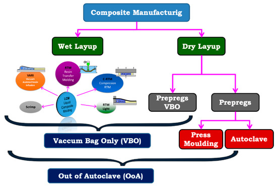 The manufacturing processes of composite materials can be divided into two large families: the wet layup and the dry layup processes (see Figure 1). Wet processes are those where the resin and the fabric have been mixed and fabrics already impregnated with the resin are supplied. The chemical polymerization reaction is “frozen” by the low supply temperature (−20 °C) and its reaction will be activated by heat. These materials are formulated with an excess of resin that must be evacuated during the fiber-compaction phase. When the resin is heated, its viscosity decreases and can flow through the thickness of the part. Thanks to this resin displacement through the thickness, the layers that form the laminate will be joined together. Autoclave, mechanical press, or atmospheric pressure can be used for compaction. This paper analyzes the forming processes compacted only with atmospheric pressure, which are known as VBO (vacuum bag only) or OoA (out of autoclave). These processes are those that have an easier processing; however, sometimes they are very expensive due to the large amount of labor they need, the cost of raw materials, etc.