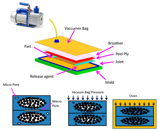 The prepreg forming process (OoA) basically consists of three stages: layup, vacuum closing, and curing. First, the prepregs are cut in the required number of layers and sizes to obtain the thickness and shape of the part. Preimpregnated layers are stacked manually or using automated techniques (automatic tape layup). Intermediate compaction steps are performed to improve the layers compaction by applying vacuum at room temperature (see Figure 2). Once the part has reached the required thickness, it is compressed under vacuum, and the curing cycle begins. During the compaction phase, physical phenomena occur that are normally neglected. These phenomena include capillarity, drainage, inhibition, or pore mobility [5].