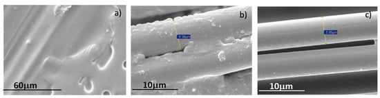 The degree of cure of three composite samples with different characteristics has been analyzed. Sample 1 is a non-cured sample, which is used as the reference. It is a carbon prepreg sheet with any degree of cure, corresponding to a sample at the beginning of the manufacturing process. Sample 2 has been semi-cured out of autoclave, and Sample 3 was completely cured also in OoA. Figure 3 shows the FESEM micrographs for the three studied samples with different degrees of cure. The effect of the cure time is evident in these micrographs, the resins covering the carbon fibers disappear with the evolution of the cure reaction. According to Figure 3, the diameter of carbon fibers was found to be about 6 µm.