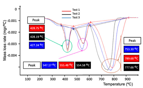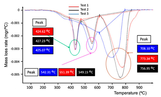 It can be noticed that in Figure 4, the first phase starts at about 425 °C, the second phase reaches a maximum rate near 550 °C, and finally, the third phase is near 790 °C. The third phase corresponds with the degradation of the residue. For both samples 2 and 3, the initial (lost) masses are shown in Table 2 and the mass losses are presented in Table 3.