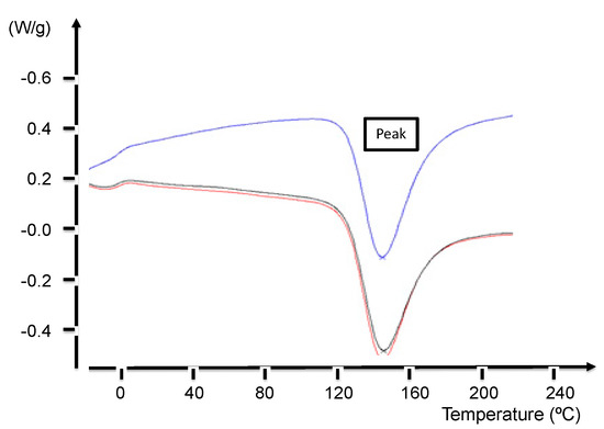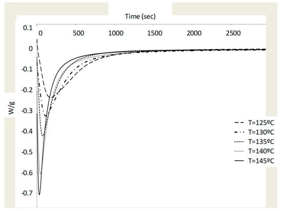 Differential scanning calorimetry (DSC) was used to characterize the degree of cure of the epoxy carbon composites. Figure 7 shows the exothermic heat curves of the epoxy system for Sample 1 at a heating rate of 10 °C/min. The area under the curve, which is calculated from the extrapolated baseline at the end of the reaction, was used to assess the total heat of the cure, giving a value of HT = 135 J/g. In general, the curing reaction of a thermosetting resin can spread over a wide temperature range. However, considering the sensitivity and response limitation to heat changes, the isothermal DSC analysis is usually run in a moderate curing range of temperature [12]. According to the dynamic curing DSC curves displayed in Figure 6, the drop on the weight is a Ti = 125 °C and it reaches a minimum at Tpeak = 145 °C. This means that the temperature for optimum curing is in the range 125–145 °C.
