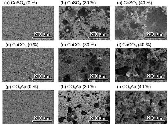 SEM images of gypsum (CaSO4) blocks (a–c), CaCO3 blocks (d–f), and carbonate apatite (CO3Ap) blocks (g–i).