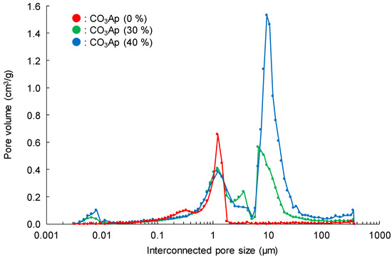 Figure 2 summarizes the pore size distribution measured by mercury intrusion porosimetry. In the case of CO3Ap (30%) and CO3Ap (40%), interconnected pores with diameters of 5–30 μm were fabricated in addition to pores that were 0.2–2 μm in diameter, which were observed also in CO3Ap (0%).
