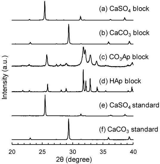 Figure 3 summarizes the XRD patterns of CaSO4 blocks before (Figure 3a) and after immersion in Na–H–CO3 (Figure 3b) and Na2HPO4 solution (Figure 3c) and those of sintered HAp blocks (Figure 3d). The XRD patterns of standard CaSO4 (Figure 3e) and CaCO3 (Figure 3f) are also presented for comparison. As shown in this Figure, CaCO3 blocks were fabricated through the dissolution–precipitation reaction when CaSO4 blocks were immersed in Na–H–CO3 solution. Next, apatite blocks were fabricated through the dissolution–precipitation reaction when CaCO3 blocks were immersed in Na2HPO4 solution (data not shown).