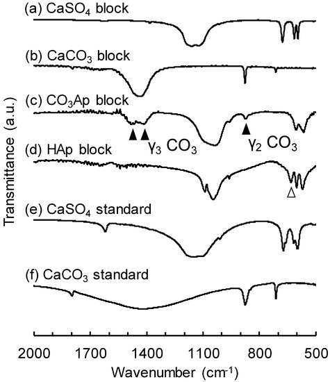 Figure 4 summarizes the FT-IR spectra of CaSO4 blocks before (Figure 4a) and after immersion in Na–H–CO3 (Figure 4b) and Na2HPO4 solution (Figure 4c) and those of sintered HAp blocks (Figure 4d). The FT-IR spectra of standard CaSO4 (Figure 4e) and CaCO3 (Figure 4f) are also presented for comparison. When CaCO3 blocks were immersed in Na2HPO4 solution, the appearance of CO3 peaks that were attributed to AB-type CO3Ap (▲) [36,37] indicated that AB-type CO3Ap was formed. No absorption peak due to apatitic OH was found. In contrast, sintered HAp exhibited absorption peaks attributed to OH (△), but no peaks attributed to apatitic CO3 were observed.