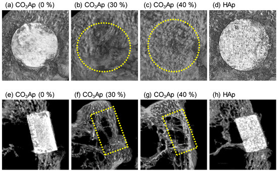 μ-CT images of (a−c,e–g) CO3Ap blocks and (d,h) HAp blocks at 12 weeks after implantation in the (a–d) sagittal plane and (e–h) coronal plane of the rabbits’ distal femurs: Yellow dotted lines indicate the implant insertion portions.