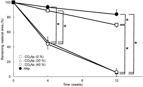 Figure 7 shows the amount of residual materials in the CO3Ap and HAp blocks. The amounts of residual CO3Ap (30%) and CO3Ap (40%) were statistically lower (p < 0.05) than those of CO3Ap (0%) and HAp (40%). In addition, the amount of remaining CO3Ap (0%) was statistically lower (p < 0.05) than that of HAp (40%). CO3Ap (30%) and CO3Ap (40%) blocks were almost completely resorbed at 12 weeks after implantation.