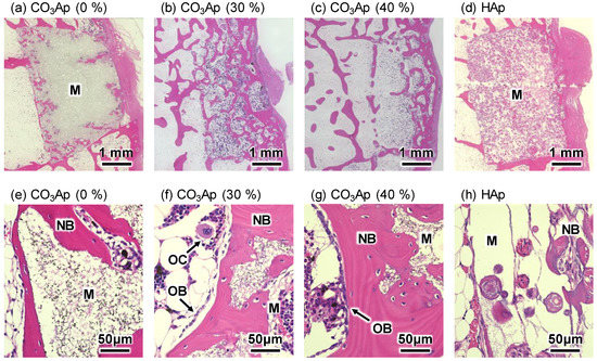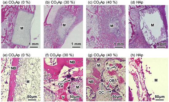 Hematoxylin and eosin (H&E)-stained histological images of the distal femurs with (a,e) CO3Ap (0%), (b,f) CO3Ap (30%), (c,g) CO3Ap (40%), and (d,h) HAp blocks at 4 weeks after implantation. M: material; NB: new bone; OB: osteoblast; OC: osteoclast; V: vessel-like tissue.