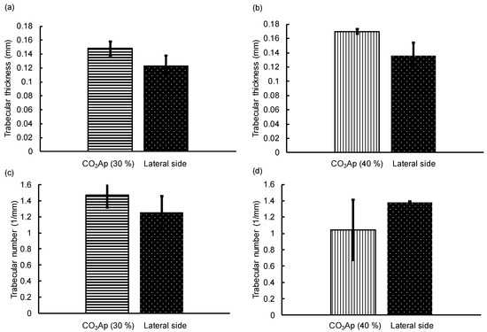 (a,b) Trabecular thickness and (c,d) trabecular number of the inserted portions of (a,c) CO3Ap (30%) and (b,d) CO3Ap (40%) blocks and the lateral side of the distal femurs.
