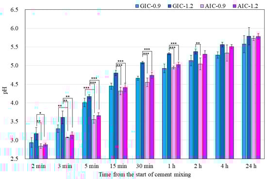 Surface pH of specimens during setting (t-test–* p < 0.05, ** p < 0.01, *** p < 0.001).