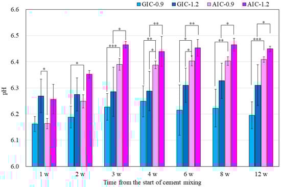 Surface pH of specimens after setting (t-test–* p < 0.05, ** p < 0.01, *** p < 0.001). w: week/weeks.