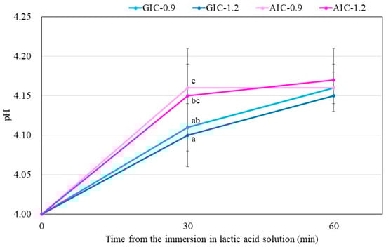 Changes in pH of lactic acid with immersed samples that were stored for one week after the start of cement mixing. Different letters indicate significant differences (t-test–p < 0.05). There were no significant differences between the values after 60 min immersion.