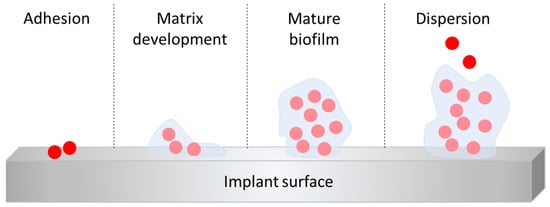 The presence of a foreign body, such as an orthopedic implant, has been shown to significantly increase susceptibility to infection. Promoting early osteoblast adhesion is essential to prevent bacterial colonization of components and promote osteointegration. If other cells adhere first, such as osteoclasts, this induces the recognition of the implant as a foreign body and induces the immune response against them. It is worse if they were bacteria present first. Bacterial colonization of the implant is the decisive step in implant-related infections and depends on the ability of bacteria to adhere to a given surface. The adhesion involves the classical physicochemical forces (Van der Waals attraction, electrostatic charges, gravitational forces, hydrophobic interactions) and specialized adhesion molecules of the bacteria [9]. In vitro, colonization appears within a few hours and slime production occurs within several days, depending on experimental conditions. It is now apparent that biofilm formation is a rather complex, genetically driven process, mediated by the number of bacteria-derived signaling molecules, also known as “quorum sensing (QS) molecules” or autoinducers. The basic steps of biofilm formation (Figure 3) are quite similar among the bacteria species: bacteria attach to a surface by means of specialized adhesion molecules, then signalling molecules are released, which in turn drive the biofilm formation by inducing the production of the extracellular matrix (extracellular polymer substances, EPS) and the name-giving (in some instances visible) film or slime, and also by altering bacteria-inherent features and properties, for example the loss of flagella. The bacteria are then embedded in the extracellular matrix, which is the most conspicuous feature of the biofilm, yielding a well-organized bacterial community. Depletion of nutrients or waste product accumulation in biofilms causes micro-organisms to enter a slow or non-growth (stationary) state, making them up to 1000 times more resistant to most antimicrobial agents than their free-living counterparts and allowing them to persist for months or years [10]. Moreover, the presence of biofilm is difficult to diagnose, since cells are protected by the biofilm layer, which can impede culturing of the bacteria.