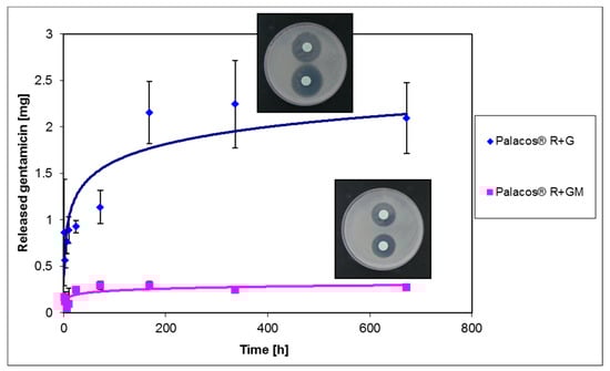 ALBC releases the antibiotic locally and directly to the site of infection. This allows higher local concentrations to be maintained compared to those obtained with intravenous administration. These concentrations exceed the limit of sensitivity for pathogens, allowing their elimination before they can develop a protective biofilm. The dosage of the antibiotic mixed with cement allows the ALBC to be divided into 2 categories: high doses of antibiotics (atb) (atb >2 g for 40 g of cement) and low doses (atb <2 g in 40 g of cement). The rationale for the choice between the two categories is the implant period: high-dose ALBC are usually adopted in cement spacers or beads (temporary implants), while low-dose ALBC are used for prophylaxis. The use of ALBC containing more than 2 g of antibiotic (for 40 g of cement) is harmful for the mechanical properties of cement and can compromise the stability of the implant itself. For this reason, the use of cements loaded with more than 2 g of antibiotic is only recommended for spacers. The release of the antibiotic is strictly time-dependent and biphasic, with a peak in the early hours, followed by a slow and progressive decrease over the following months or years. The initial release depends on the roughness of the surface: the greater the roughness, the greater the area of release; a week after the intervention, a linear dependence between the porosity of the cement and the release of the antibiotic was demonstrated. Some studies have also shown how the release of cement also depends on the type of cement used [48]. To achieve a broader spectrum of action and efficacy it is possible to combine two or more antibiotics, exploiting their synergistic effect [47,49,50]. Comparison between spacers loaded with the combination of gentamicin and vancomycin and spacers loaded with gentamicin alone has shown the higher antibacterial efficacy of the former. Finally, the antibiotic can be industrially blended into the pre-polymerized PMMA or can be manually added by a surgeon at the surgical site [17,51]. Figure 4 reports the trend of cumulative release of gentamicin-containing Palacos® R + G (commercial sample) and Palacos® R + GM (sample with gentamicin manually (M) added), together with the respective images of inhibition zones [16]. As can be noticed, in this study the authors observed a similar release antibiotic trend for both cement formulations, but commercially-loaded cements released a higher amount of gentamicin than Palacos® R + GM and showed a larger inhibition zone (i.e., greater antibacterial effect) towards S. aureus strain. The best blending process has been thoroughly investigated in literature; however, at present, the best mixing method remains under debate [3,4,5,52].