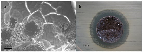 Hydroxyapatite precipitation on copper-doped glass containing composite bone cement (a). Antibacterial effect towards S. aureus (inhibition halo test) of a composite cement containing silver-doped glass (b).