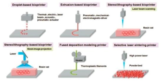 The first technology was stereolithography, which consists of the solidification of a photosensitive material by an ultraviolet light source []. Later, other 3D printing techniques were conceived such as fused deposition modelling (FDM) [], inkjet printing, direct laser patterning, cell-sheet technology, cell-laden technology, extrusion-based printing [], valve-based technology, acoustic printing [], selective laser melting [], selective laser sintering [], and laminated object manufacturing []. Some of these technologies can be seen in Figure 1. All of them can also be classified into four different categories, like extrusion printing, material sintering, material binding, and lamination [].